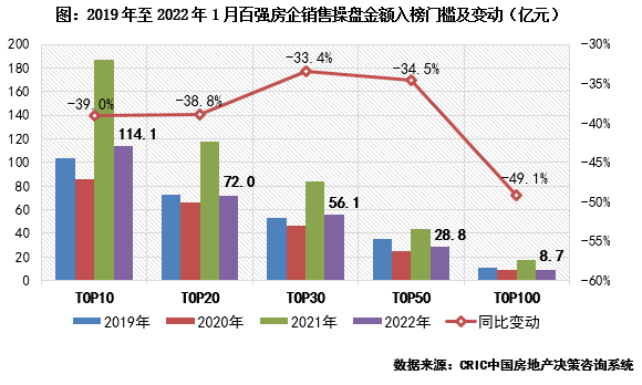 2022年1月,百強(qiáng)房企各梯隊(duì)銷售門檻較去年同期顯著降低。其中,TOP10和TOP20房企銷售操盤金額門檻分別為114.1億元和72億元,同比降低39%和38.8%。TOP30和TOP50房企的銷售操盤金額門檻也分別同比降低34%左右,門檻值僅略高于2020年同期。而TOP100房企的銷售操盤金額門檻同比降幅最高達(dá)49.1%,8.7億元的門檻值也處在近年來的最低水平。