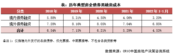 融資成本:2022年1月100家典型房企新增債券類1融資成本4.53%,較2021年全年下降下降0.76pct,其中境外債券融資成本達(dá)6.85%,下降0.19pct,境內(nèi)債券融資成本3.20%,下降0.87 pct。環(huán)比2021年12月來看,總?cè)谫Y成本環(huán)比上升0.01pct,境外融資成本環(huán)比下降0.16pct,境內(nèi)融資成本環(huán)比下降0.53pct。境內(nèi)發(fā)債的企業(yè)中,可以進(jìn)行發(fā)債的企業(yè)成本相對(duì)較低,融資利率在2.50%-4.00%間,白名單企業(yè)繼續(xù)發(fā)揮融資優(yōu)勢(shì),繼續(xù)發(fā)行利率較低的債券;境外發(fā)債成本方面,旭輝、遠(yuǎn)洋等發(fā)行了綠色擔(dān)保票據(jù),其成本不超過5%,也相對(duì)較低,還有部分企業(yè)完成了境外債的交換要約和額外發(fā)行,成本相對(duì)較高。
