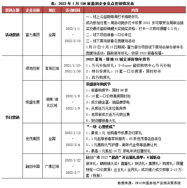 新年伊始,房企營(yíng)銷積極性并不高,主要依托元旦和春節(jié)展開節(jié)日營(yíng)銷活動(dòng)。從市場(chǎng)來看,1月市場(chǎng)堪稱冷淡,29個(gè)重點(diǎn)監(jiān)測(cè)城市商品住宅供應(yīng)面積同、環(huán)比分別下降43%和58%,成交面積環(huán)比下降37%,同比跌幅擴(kuò)至46%。從營(yíng)銷來看,本月房企營(yíng)銷積極性不高,少有房企推出集團(tuán)性活動(dòng),區(qū)域聯(lián)動(dòng)營(yíng)銷也比較少,僅有世茂、綠地、融創(chuàng)、榮盛等房企推出了一些節(jié)日活動(dòng),自碧桂園21年底推出步數(shù)打卡,富力本月借助東奧契機(jī)亦推出“線上公益跑”打卡活動(dòng)。