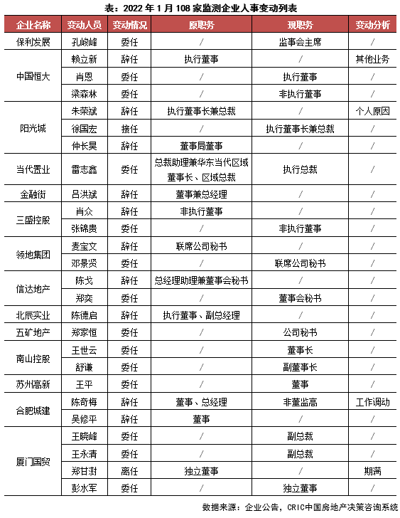 1月,房企高層人事動(dòng)態(tài)信息數(shù)量較前一月有所減少,從108家監(jiān)測(cè)企業(yè)的人事變動(dòng)情況來看,房企對(duì)組織架構(gòu)的調(diào)整、管理層重組都有所減緩。