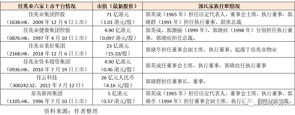 2、這六家上市主體的一把手基本均由郭氏家族擔任,如郭英成分別擔任佳兆業集團控股、佳兆業資本投資集團的董事會主席、星島新聞集團的法定代表人和董事會主席,而郭英成的三個子女郭曉群、郭曉欣、郭曉亭也在六家上市主體中擔任要職。