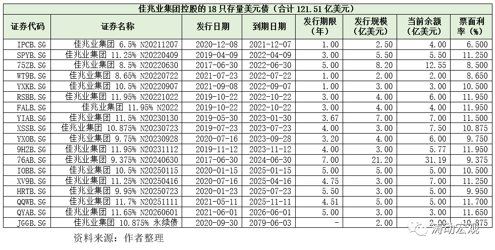 截至目前,佳兆業體系擁有不足15億元人民幣的境內債券。不過相較而言,需要更為關注18只高利率的存量美元債,余額合計達到121.51億美元(折合人民幣800億元左右)。
