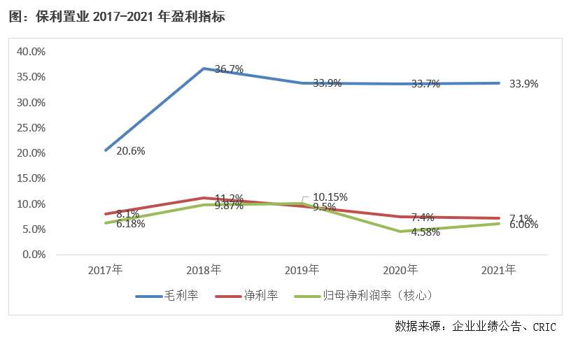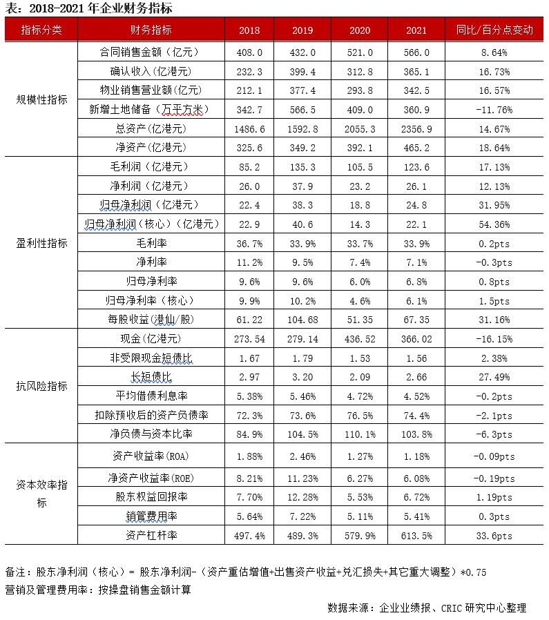 【營收未恢復疫情前水平,凈利率仍有改善空間】2021年營業收入穩步增長,同比增加16.73%至356.13億港元,仍低于2019年的水平。從內地營業收入來看,2021年保利置業內地營業收入同比增長了12%,也較2019年的水平增長了8%,內地結轉得到穩定增長。凈利率7.1%,歸母核心凈利率6.1%,均低于行業平均,未來隨著低毛利率項目的逐步結轉,其盈利率水平受到的壓力或將更大。