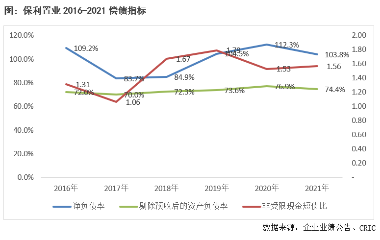 債務結構的改善也助力企業杠桿水平的降低,2021年末凈負債率同比下降6.3個百分點至103.83%。剔除預收后的資產負債率也同比下降2.1個百分點至74.4%。整體來看,2021年末保利置業三條紅線指標雖有所改善,但仍觸及兩條紅線,未來仍需進一步加強。