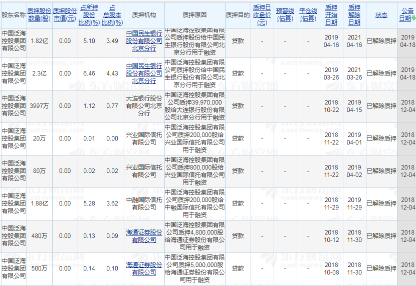 風財訊整理發現,中國泛海直接控股的四家上市公司:泛??毓桑ǔ止?0.91%)、民生控股(持股22.56%)、中泛控股(持股74.95%)、中國通海金融(持股72.51%),十年間幾乎都被反復質押,均是無間隙質押和發債融資