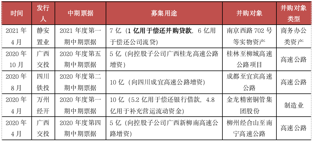 并購票據(jù)最早于2013年交易商協(xié)會才開展注冊研究;2014年貴州開磷在銀行間市場發(fā)行了首單用于支付并購價款的并購票據(jù);2020年4月,全國首單增強型并購中期票據(jù)——廣西交通投資集團2020年第四期中期票據(jù)成功發(fā)行,募集資金拓展至用于向發(fā)行人控股子公司增資。