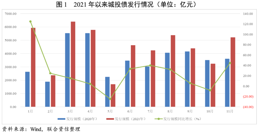 2021年以來,城投企業融資政策收緊,但市場流動性仍保持整體寬松,同時產業類債券尤其是房企債券信用風險持續暴露,導致一級市場出現結構性資產荒,綜合影響下,城投債發行規模持續增長。2021年1-11月,發行城投債的主體數量同比增長7.78%,城投債發行數量及發行規模同比分別增長34.17%和24.12%,仍保持增長態勢,但增速較上年同期(74.15%和67.84%)均明顯回落。具體來看,除5月份和10月份城投債發行規模小于上年同期外,其他月份均高于上年同期水平。國發〔2021〕5號文及交易所公司債審核指引于4月份集中發布,嚴監管下5月份城投債發行規模較上年同期下降24.61%;10月份,房企債務違約影響持續發酵疊加節假日因素,城投債發行規模較上年同期下降8.02%。