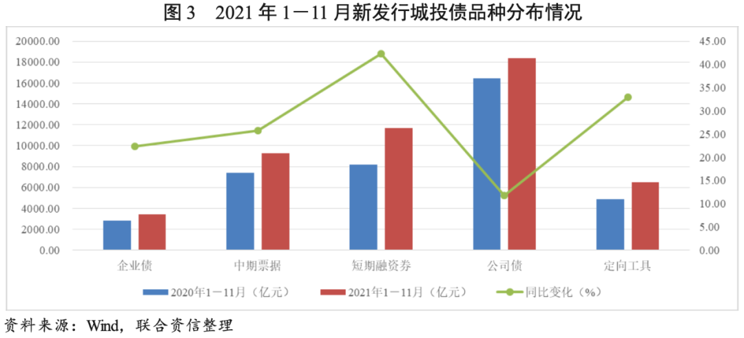 從發行品種來看,2021年1-11月,新發行城投債以公司債(占37.25%、)、短期融資券(占23.71%)和中期票據(占18.84%)為主,受滬深交易所收緊城投債發行審核條件影響,公司債發行規模占比較上年同期的41.36%下降4.11個百分點,發行規模增速由上年同期的117.91%大幅回落至11.79%。短期融資券發行規模較上年同期繼續保持較快增長,發行規模占比較上年同期的20.68%提升3.03個百分點,融資政策收緊引發市場對部分地區城投企業償債能力擔憂,風險偏好有所下降,對短期限產品更為青睞。