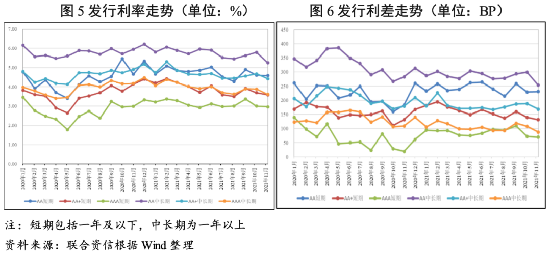 2021年以來,債券市場資金面表現為“先邊際收緊后逐步放松”。具體來看,2021年上半年,隨著國內疫情形勢趨于穩定,經濟穩步復蘇,債券市場資金面延續了2020年下半年以來邊際收緊的趨勢;2021年下半年,隨著央行全面降準以及下調金融機構存款準備金率等釋放流動性,市場資金面趨緊態勢有所回暖。受市場流動性變化的綜合影響,2021年1-11月,不同期限債券的發行利率和發行利差走勢呈現分化,短期城投債的發行利率和發行利差較2020年均有所上升,中長期城投債的發行利率變化不大、發行利差均有所下降。不同地區城投債發行利差分化較為明顯。