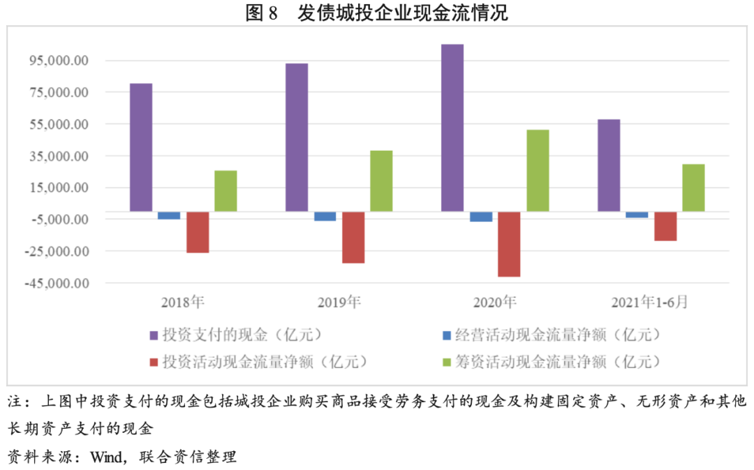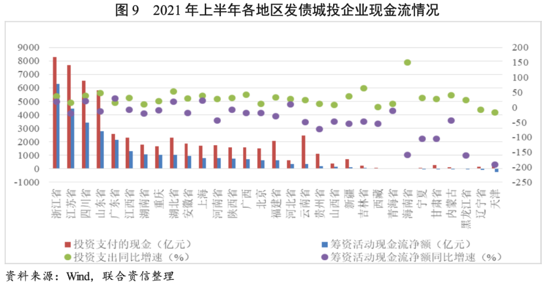城投企業保持基礎設施建設投資力度,但不同地區基建投資增速有所分化。2021年上半年,城投企業投資力度加大,但凈融資規模收縮,資金壓力整體上升。