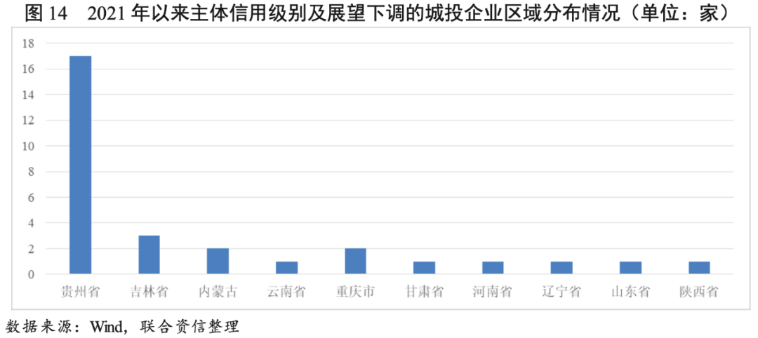 監管趨嚴、融資政策收緊導致政府債務負擔較重地區的弱資質城投企業流動性風險上升,區域經濟及財力下滑、短期償債壓力大、出現風險事件等具體因素影響下,城投企業主體信用等級及展望下調數量同比明顯增加。