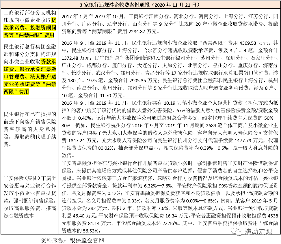 2020年11月21日,國務(wù)院辦公廳督查室、銀保監(jiān)會(huì)辦公廳聯(lián)合發(fā)布《關(guān)于部分銀行保險(xiǎn)機(jī)構(gòu)助貸機(jī)構(gòu)違規(guī)抬升小微企業(yè)綜合融資成本典型問題的通報(bào)》,指出工行部分分支機(jī)構(gòu)、民生銀行、平安保險(xiǎn)(集團(tuán))下屬平安普惠等機(jī)構(gòu)在貸款中違規(guī)收取應(yīng)減免費(fèi)用,強(qiáng)制捆綁銷售,收取高額服務(wù)費(fèi)和代理手續(xù)費(fèi)。