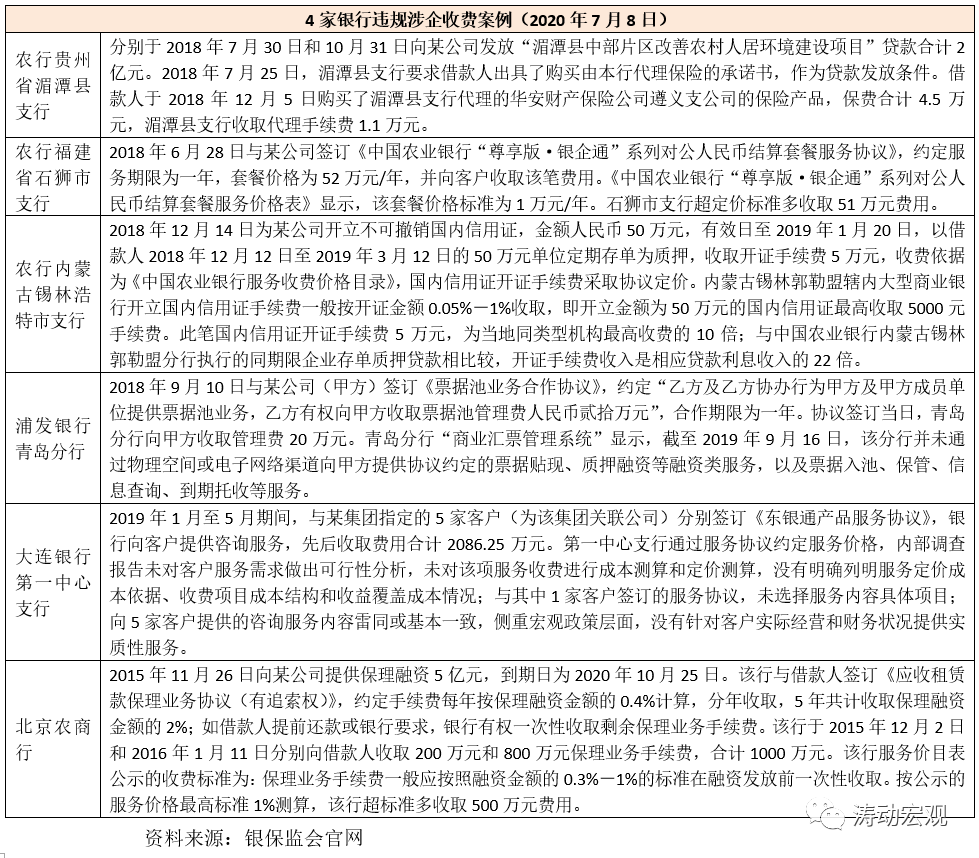 2020年7月8日,銀保監(jiān)會(huì)消費(fèi)者權(quán)益保護(hù)發(fā)布《關(guān)于銀行違規(guī)涉企收費(fèi)案例的通報(bào)》,通報(bào)了6個(gè)違規(guī)涉企收費(fèi)案例,具體涉及農(nóng)行(3個(gè)案例)、浦發(fā)銀行、大連銀行以及北京農(nóng)商行等4家銀行。