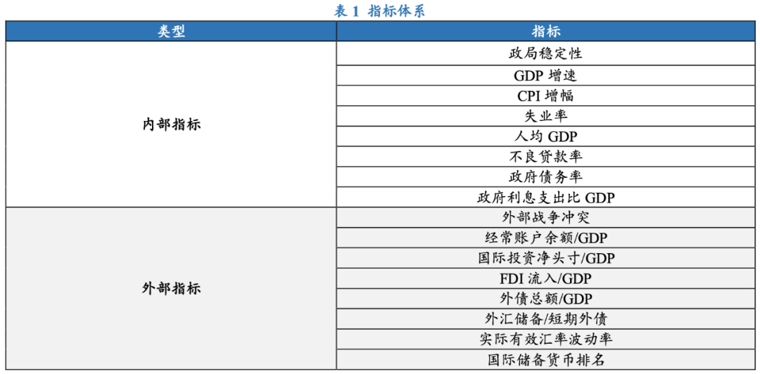 在綜合考察影響各國穩定性的多個內部和外部因素的前提下,我們結合指標經濟內涵和數據的可得性,最終選取了16個指標,內部和外部因素各8個。同時,我們利用熵權法確定指標權重。熵值是一種物理計量單位,熵越大說明數據越混亂,攜帶的信息越少,效用值越小,因而權重也越小。熵權法是結合熵值提供的信息值來確定權重的一種研究方法,可以充分利用指標的區分信息并排除人為主觀因素的影響。