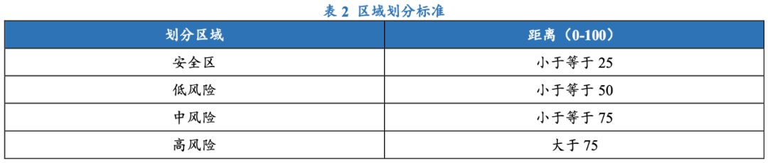 在內外評價排名的基礎上,我們建立了二象限矩陣,并以各國與原點的距離為基礎劃分安全區、低風險、中風險和高風險區域,劃分標準如下。
