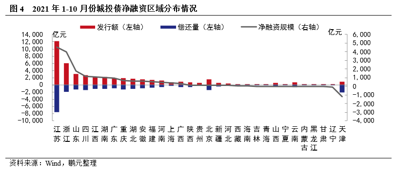 10月份浙江、福建凈融資規(guī)模較大,凈償還的省份增加。10月份,浙江、福建凈融資規(guī)模分別為111.16億元、66.10億元,位居前兩位;凈償還城市較上月增加5個至15個,天津凈償還130.78 億元、江蘇凈償還93.07 億元,湖北、云南、甘肅的凈償還規(guī)模在30-50億元。