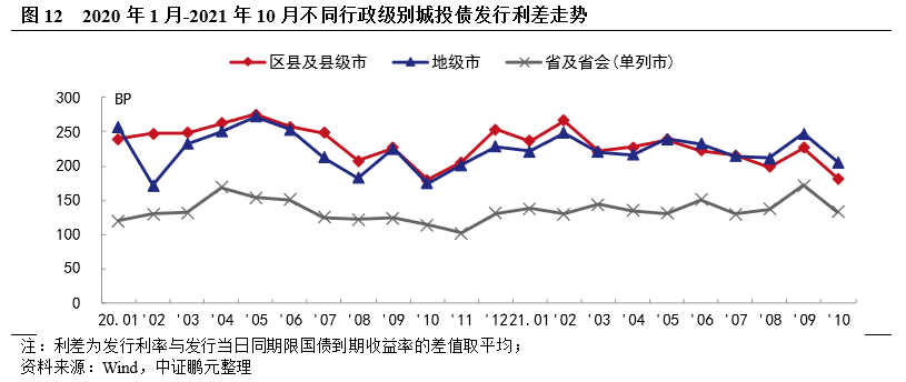 從各級別城投平臺平均發(fā)行利差來看,2021年10月份發(fā)行利差均下行。區(qū)縣級、地市級、省級平臺的平均利差分別為182 BP、206 BP、133 BP。由于發(fā)債主體整體資質(zhì)上升以及債券期限縮短等因素,各級平臺的發(fā)行利差均下降。整體來看,近期城投債利差水平基本維持穩(wěn)定,未來利差仍將圍繞中樞波動。