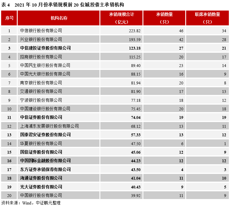 2021年10月份,共有90家機(jī)構(gòu)參與了城投債的承銷工作,其中券商56家,銀行機(jī)構(gòu)34家。就承銷規(guī)模而言,中信銀行以223.82 億元的承銷規(guī)模位居第一,位居首位;興業(yè)銀行以193.59億元的承銷規(guī)模位居第二,中信證券、招商銀行、民生銀行的承銷規(guī)模分別位于第三至五位。就券商機(jī)構(gòu)而言,券商機(jī)構(gòu)合計(jì)承銷918.03億元,占總發(fā)行額的38%,以中信建投、中信證券、國泰君安的承銷規(guī)模較大,分別位于第3、11、13位。