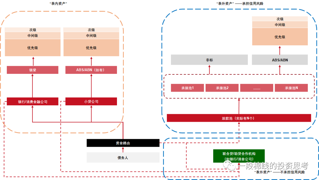 1)零售信貸行業(yè)完整的“資產(chǎn)負債表”應(yīng)該囊括所有實際承擔(dān)信用風(fēng)險、賺取超額收益的資產(chǎn)及負債(應(yīng)并入實際抽走超額收益并隱含承擔(dān)還款義務(wù)的金融產(chǎn)品);