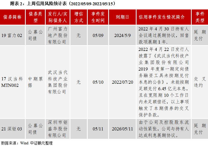 上周發生3起信用風險事件:廣州富力地產股份有限公司(19富力02,延期兌付)、武漢當代科技產業集團股份有限公司(17漢當科MTN002,交叉違約)、深圳市鉅盛華股份有限公司(21深鉅03,延期兌付)。