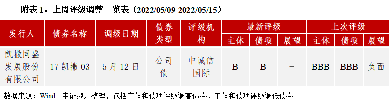 上周(2022/05/09-2022/05/15)僅有1只債券負面評級調整。凱撒同盛發展股份有限公司最新主體評級為B,債項評級為B,上次主體評級和債項評級為BBB,涉及17凱撒03。