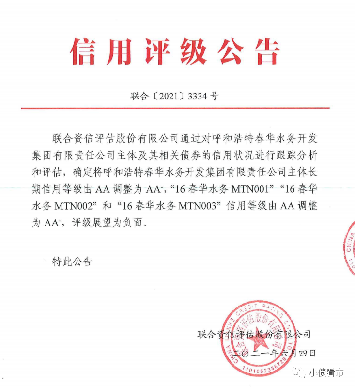 6月4日,聯合資信公告稱,將呼和浩特春華水務開發集團有限責任公司(以下簡稱“春華水務”)主體和相關債項信用等級由AA調整為AA-,評級展望為負面。