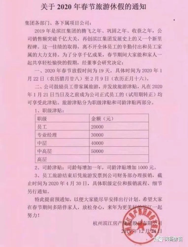 為分享千億成果,濱江不僅給出房企最長假期,還鼓勵員工帶家屬旅游,并且發(fā)放旅游津貼消息一出,酸倒了一大片地產(chǎn)人