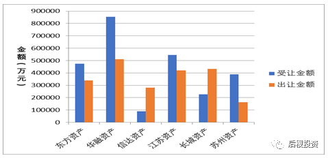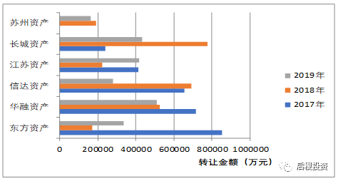 從上圖所知,華融資產、長城資產、江蘇資產位列前三甲,且出讓金額均超過40億元;相比2018年,信達資產和東方資產情況截然相反,分別減幅和增幅近半。成立于2016年5月底的蘇州資產,17年沒有出讓記錄,這兩年出讓金額穩定在20億左右。