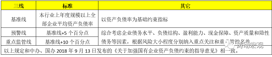 1、根據2018年9月13日中辦和國辦發布的《關于加強國有企業資產負債約束的指導意見》,3號文按照資產負債率的基準線、預警線和重點監管線等三線要求對地方國企實行名單制管理,即對資產負債率超過警戒線和重點監管線的企業,根據風險大小程度分別納入兩重(即重點關注和重點管控企業)。