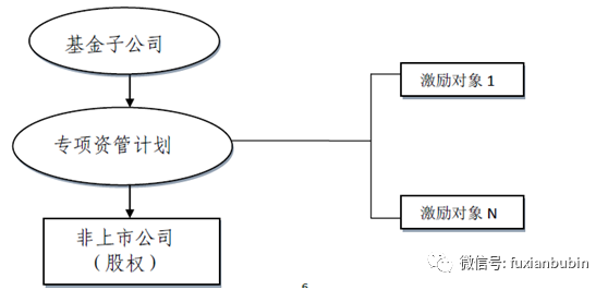 該模式主要通過基金公司或資產管理公司設立資產管理計劃投資擬實施員工持股計劃的上市公司的股票,其中以“康源藥業員工持股方案”為典型;或者通過基金公司下設的子公司設立專項資產管理計劃投資擬實施員工持股計劃的非上市公司的股份,其中以“民生電商員工持股方案”為典型。具體模式如圖所示: