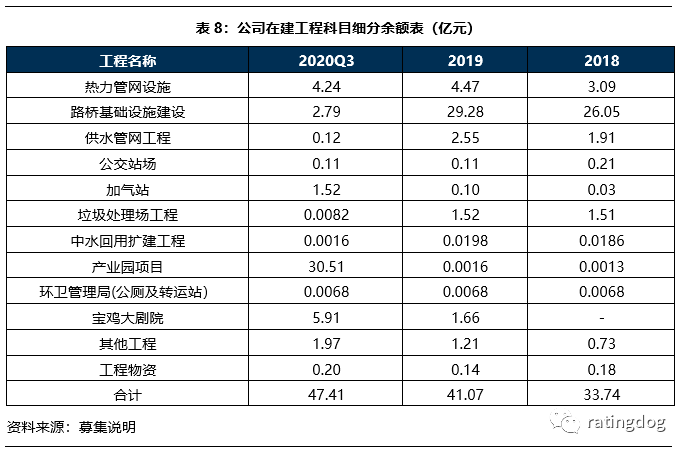 從靜態角度看,截至2020年9月末,公司資產總額為513.6億元,其中余額較大的科目為:1、存貨,主要為開發成本,包括土地使用權、三通一平、土地拆遷補償以及棚改工程建設成本;2、其他應收款,主要為公司對其他企業的棚戶區改造借款、往來款、工程款等,對象基本為寶雞當地企事業單位及政府機構,成色足;3、持有至到期投資:主要為發放給寶雞市當地國企和公用事業單位的長期委托貸款(58.5億元),包括公司承接國開行專項貸款并轉貸給棚改項目實施單位的棚改項目資金,以及公司以自有資金發放的委托貸款;4、固定資產,主要房屋、建筑物、路橋基礎設施等;5、在建工程,主要由主營的供熱、供水、公共交通服務相關的基建項目、寶雞大劇院和產業園項目構成。