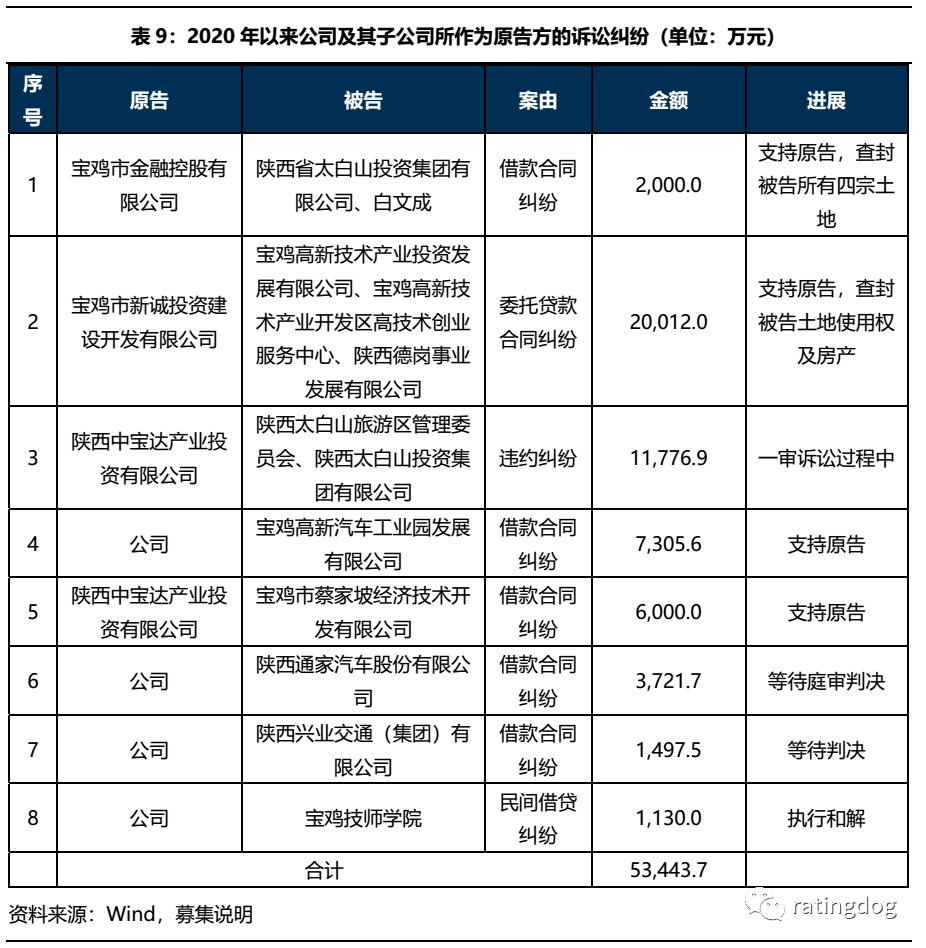 除上表所列案件以外,截至2020年9月末,公司對寶雞市文化旅游產業發展集團有限公司(簡稱“寶雞文旅”)的擔保余額為4.375億元,其中與陜西省國際信托股份有限公司(簡稱“陜國投”)的債務為2.5億元,部分已到期,寶雞文旅正在與陜國投協商。