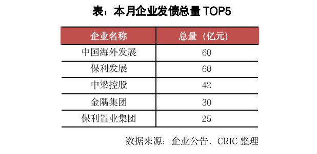 本月100家典型房企的融資總量為519.75億元,環(huán)比減少40.3%,同比減少50.2%,單月融資規(guī)模是2019年以來第三低。其中債券發(fā)行了375.07億元,環(huán)比增加0.6%,同比減少35.2%。本月房企融資成本4.81%,環(huán)比上升1.55pct,同比下降0.4pct。其中境內融資成本3.73%,環(huán)比上升0.5pct,發(fā)債主體仍是集中在中海、保利發(fā)展、華潤置地等國企央企;境外融資成本為10.38%,環(huán)比大幅提升了6.58pct,主要是因為本月中梁和大唐因為交換要約發(fā)行了3筆優(yōu)先票據(jù),融資成本都相對較高。
