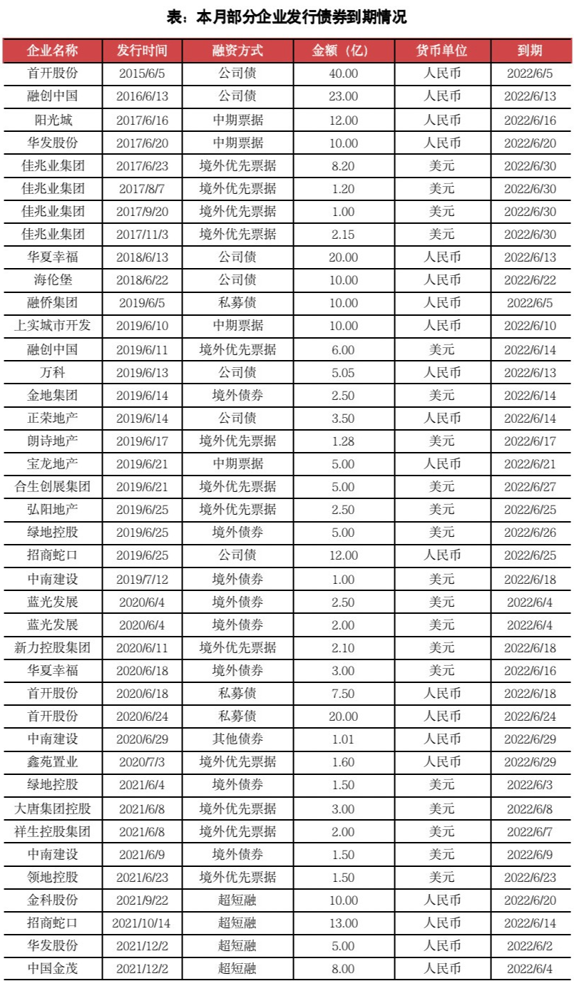提前關注到2022年6月將有44筆債券到期,合計約639億元,環(huán)比增加68.6%,又一波償債潮即將到來。其中,佳兆業(yè)到期的4只境外優(yōu)先票據(jù)、新力到期的一只優(yōu)先票據(jù)以及華夏幸福的一筆境外債已經(jīng)出現(xiàn)了利息違約。從到期債券規(guī)模來看,單筆金額最高為佳兆業(yè)于2017年發(fā)行的8.2億美元的境外優(yōu)先票據(jù)。