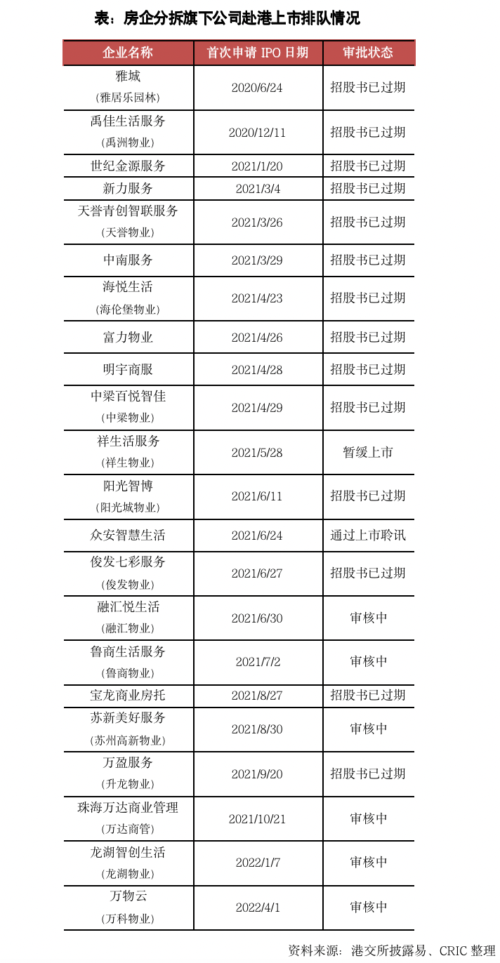 在房企分拆旗下公司上市方面,本月沒有房企旗下公司遞交招股書。因此截至2022年5月底,在港交所遞交過招股書而仍未上市的房企旗下公司共有22家,其中有多家企業(yè)的招股書都已過期,未來是否還會堅持上市有待觀察。