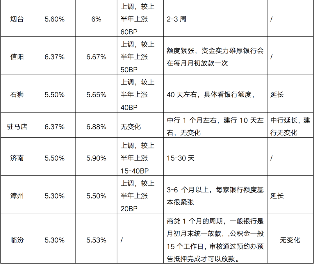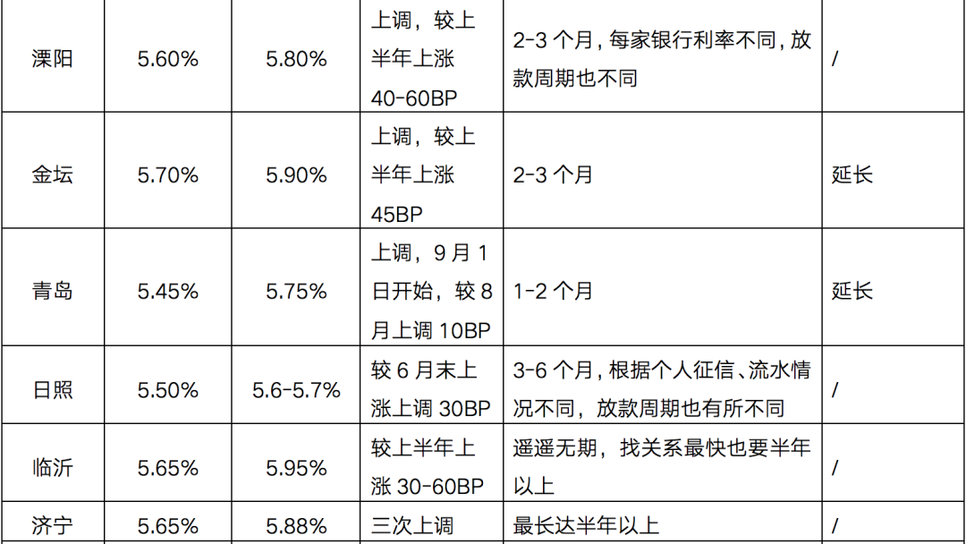 綜合來看,3-6個月的放款周期已成為常態(tài),臨沂、濟寧、菏澤等山東地市放款周期高達(dá)半年以上,還有部分諸如蘇州、泰州、鹽城等信貸端全面收緊,放款時間不定。