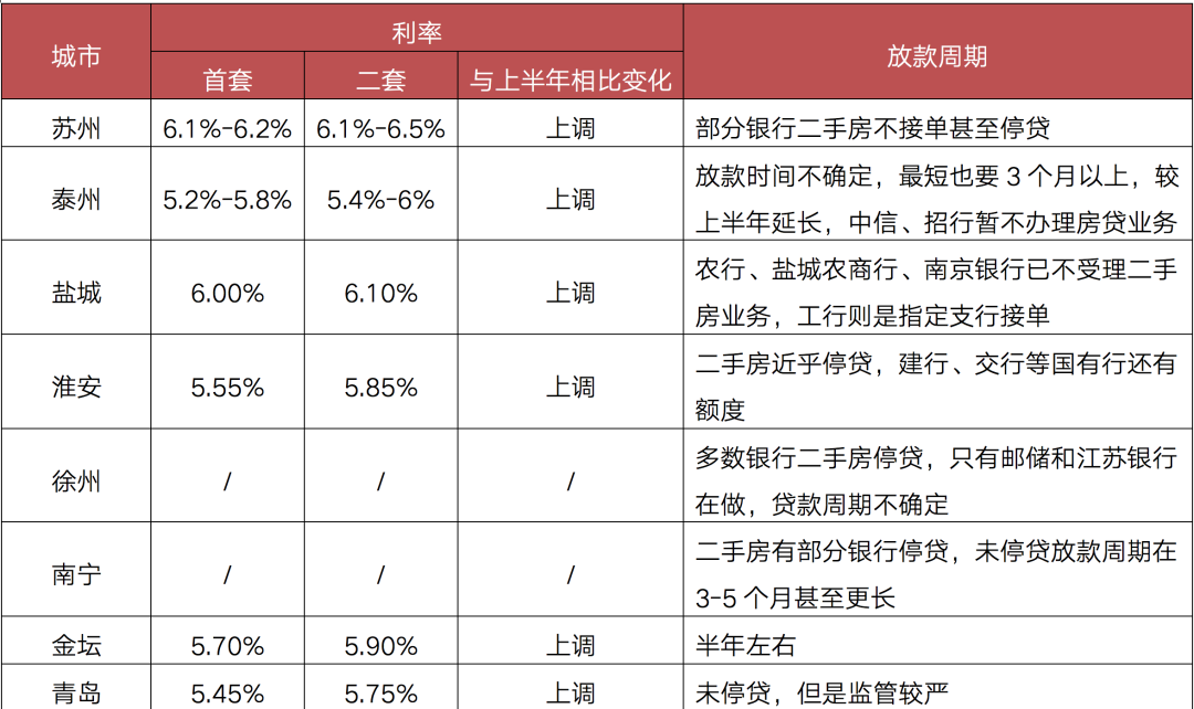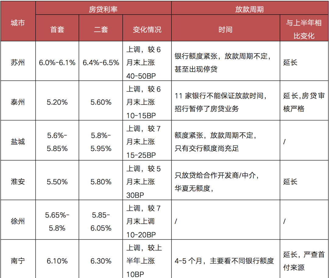 比如,蘇州目前首套房房貸利率在6.0%-6.1%之間,較6月末上漲40-50BP,與此同時,銀行額度緊張,放款周期不定,甚至部分銀行出現(xiàn)“停貸”。