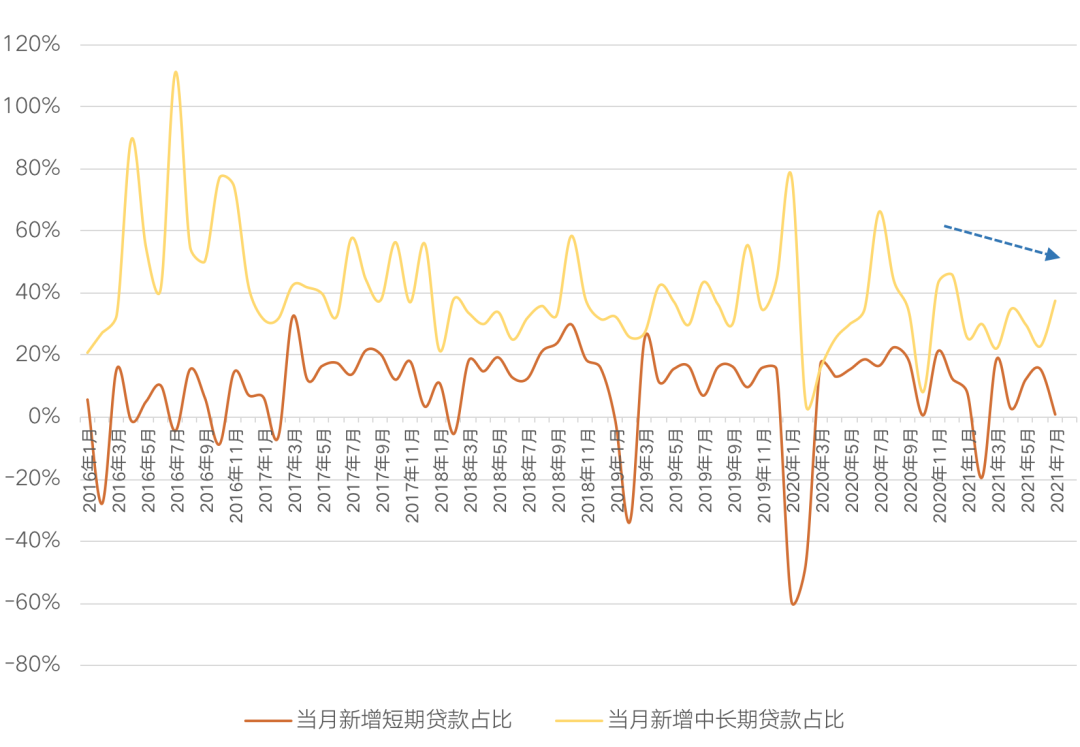 如今,該政策已執(zhí)行九個多月。自年初以來,住戶部門新增中長期貸款占比便呈現(xiàn)出波動下行趨勢,上半年基本保持在30%以內(nèi),7月雖略有回升,但總體也低于2020年末46%的階段性高點,這也意味著央行信貸收緊的政策初顯成效,居民高杠桿購房情況有所緩解。